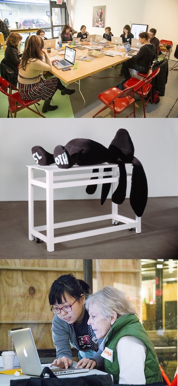 Photo 1: Editors at the resource table during the Wikipedia Art+Feminism Edit-a-thon at Eyebeam in Chelsea (CC BY-SA MICHAEL MANDIBERG)